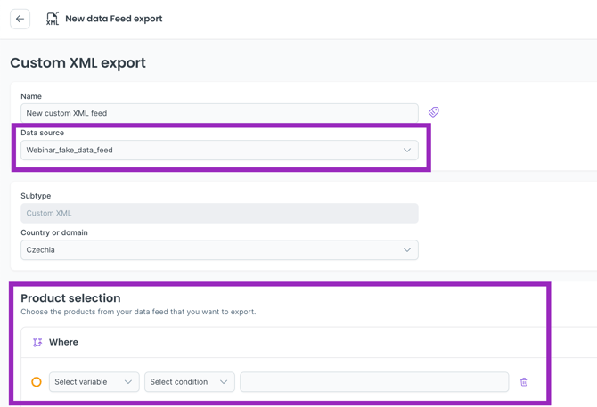 Select the data source you want to use for the export. This determines which products will be included in your feed. Apply Filters (Optional) If you want to narrow down the selection further, you can apply filters to include specific products: