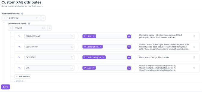 You start adding specific values. For each one, set a name (e.g., PRODUCT_NAME) and map it to the corresponding variable from your feed (e.g., TITLE). This way, you fully customize the output structure of the feed.