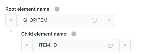 This is the container for individual product data. All the information for one product will be placed inside this element, and it will repeat for each product in your feed. A common name would be ITEM_ID, but you can use your own naming.