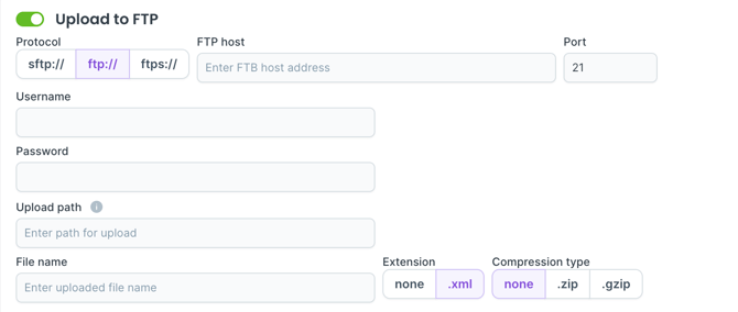 Save the feed and use the generated URL, or Choose FTP upload if you need to send the feed directly to a specific platform: