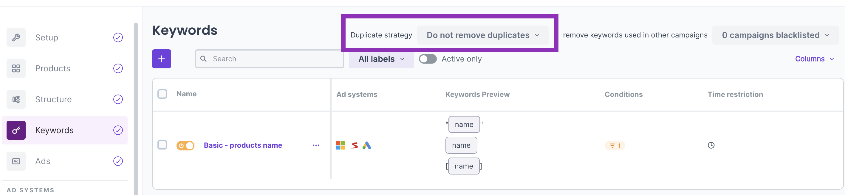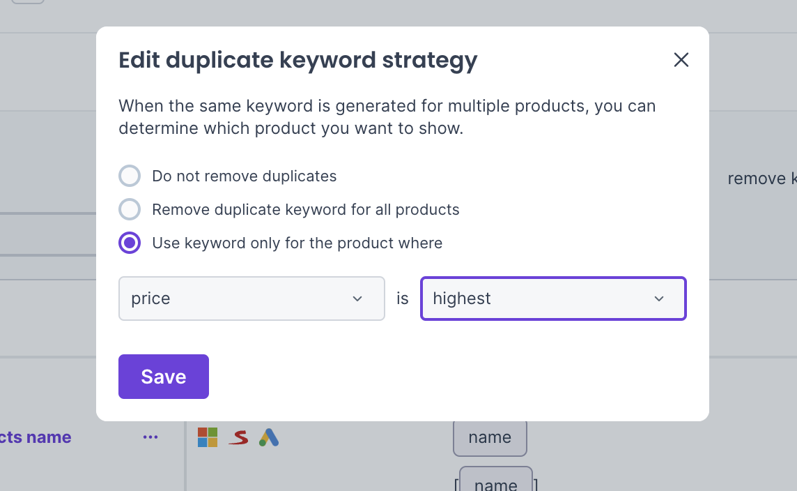 It may happen that identical keywords are generated for multiple products. Fortunately, you can decide what will happen with such a keyword thanks to a duplicate keyword strategy. You can find the setting in the keyword generators overview.