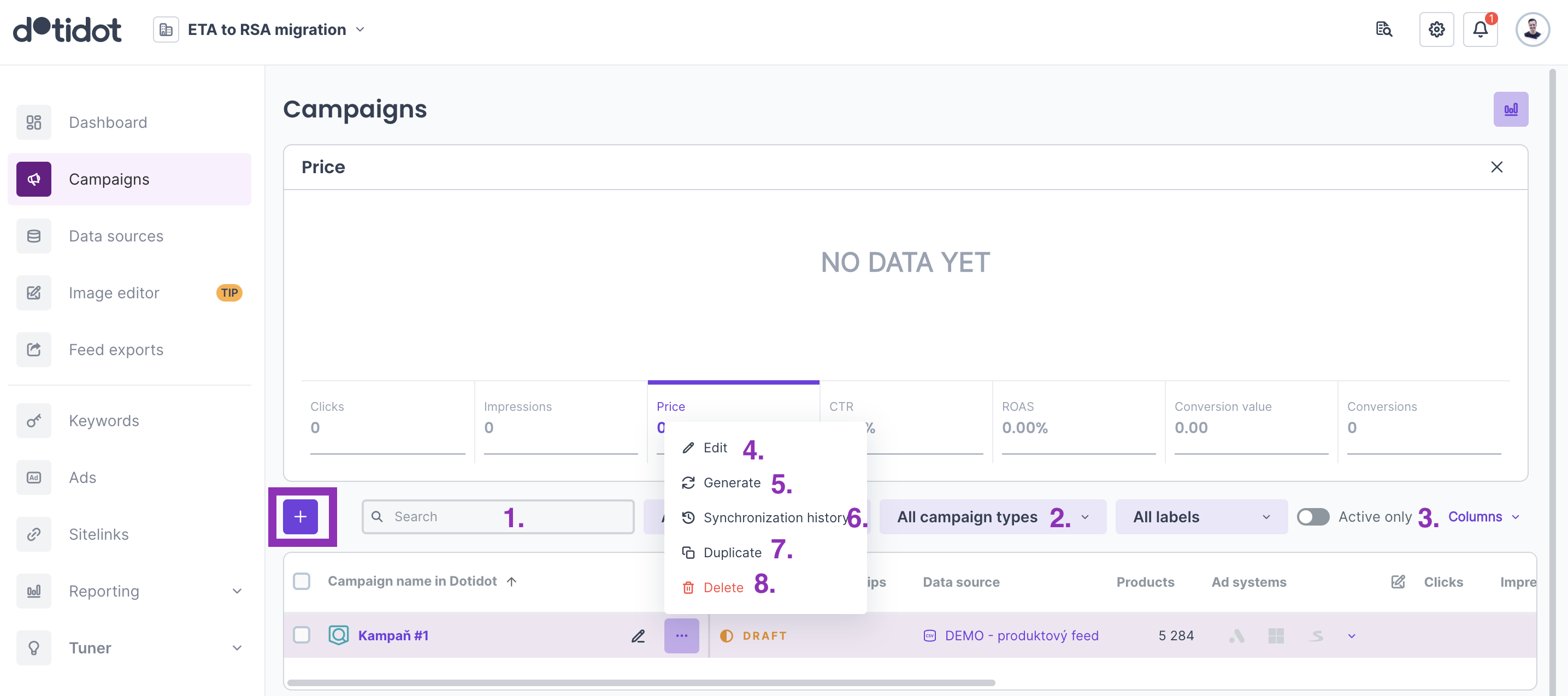 In the menu you can also edit the campaign (4.), generate campaign (5.), synchronised it (6.), duplicate it (7.) or delete it (8.).