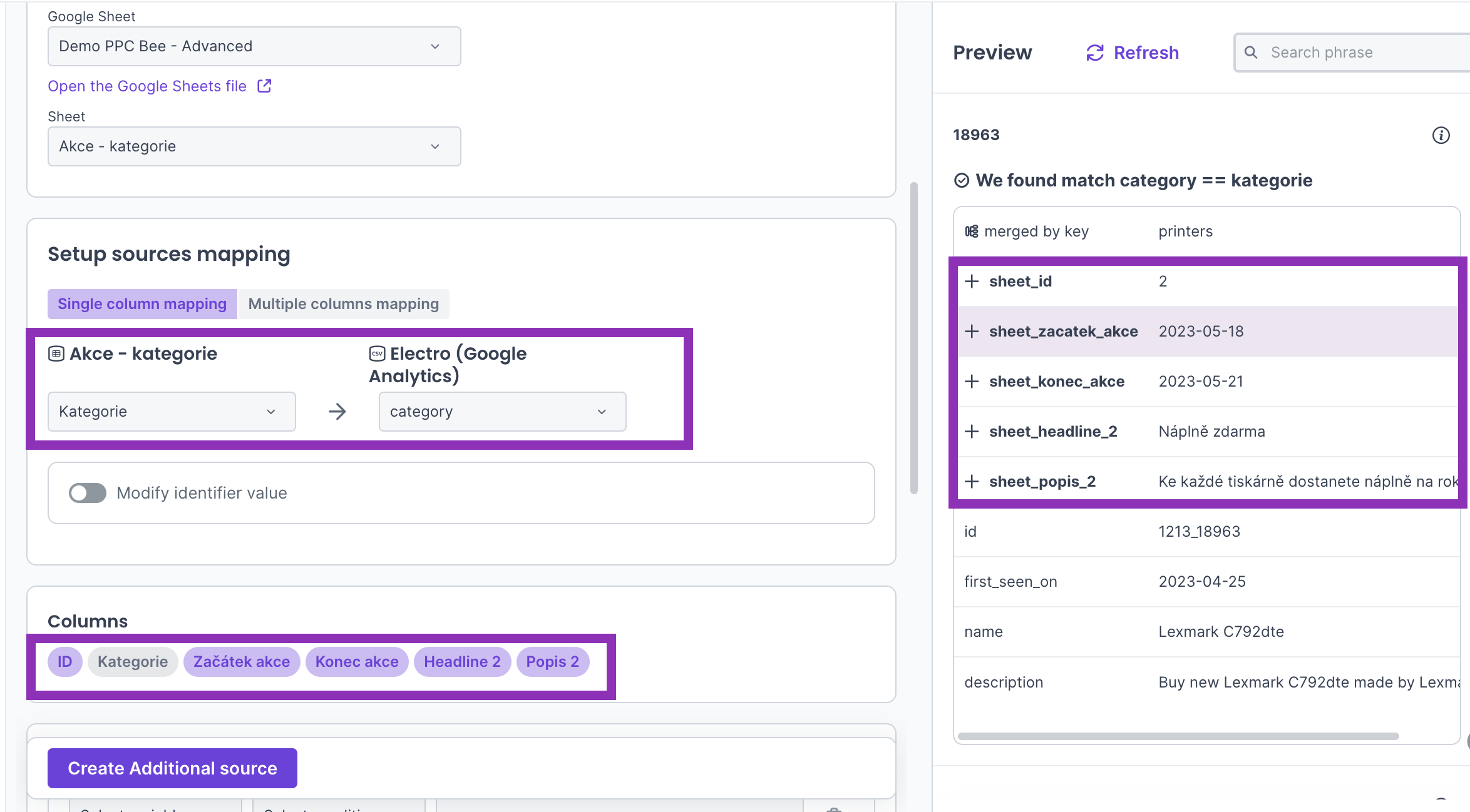 - In the right column we ca see a preview of the values that have been merged.