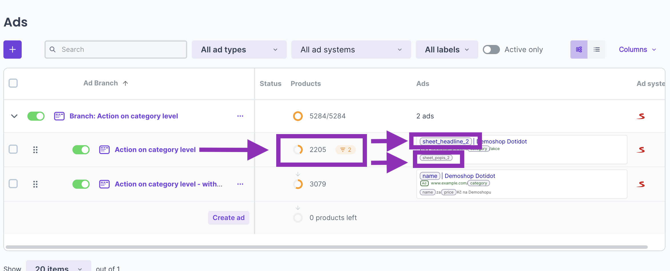 Then, in the same branch, create a second ad that is without the condition and does not use the variables from the action. That means, the product will pass this variant whenever it does not have an active action.