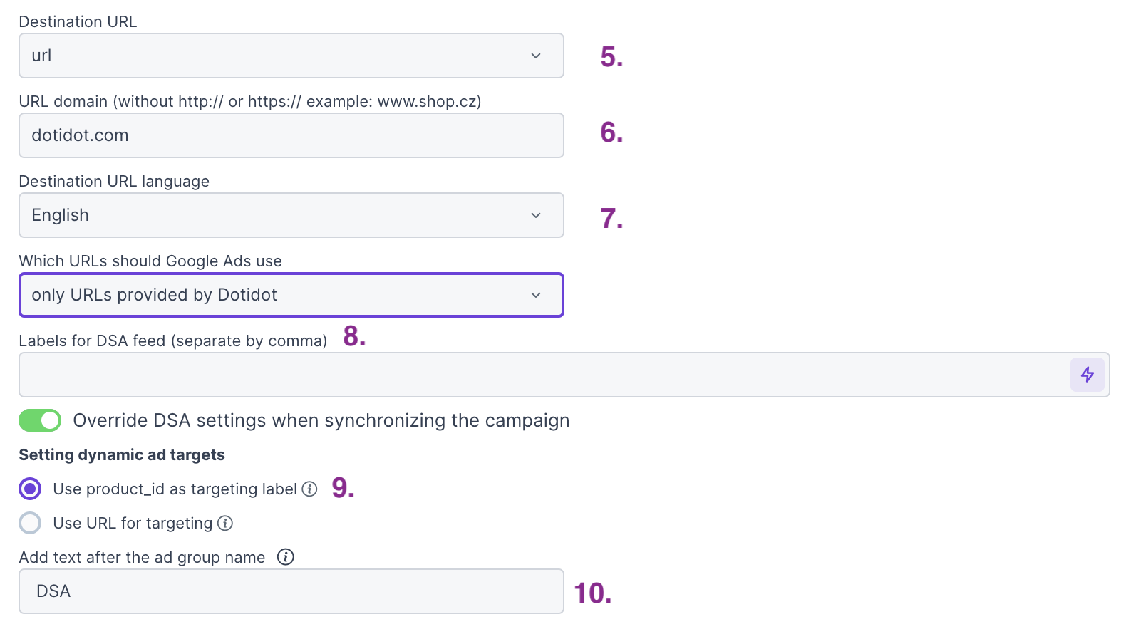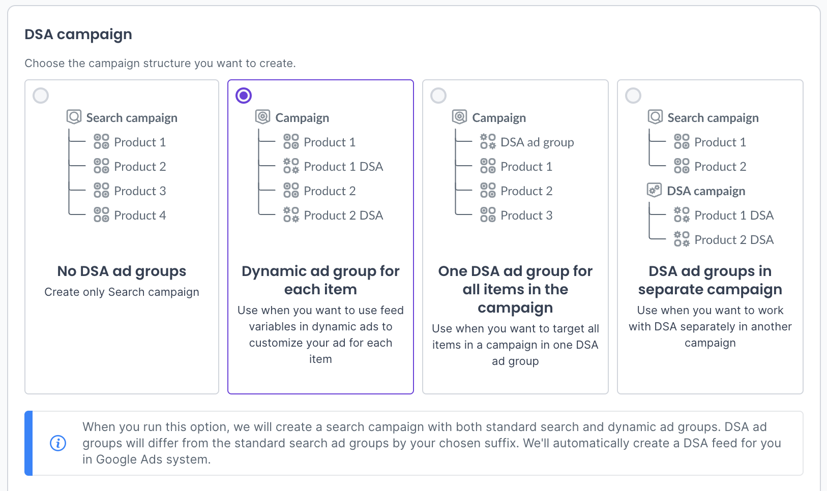 - This option will create a search campaign that includes both standard and dynamic adgroups for each item. The DSA adgroups will differ from the standard ones by the chosen suffix. We will automatically create DSA feed for you in the Google Ads system.