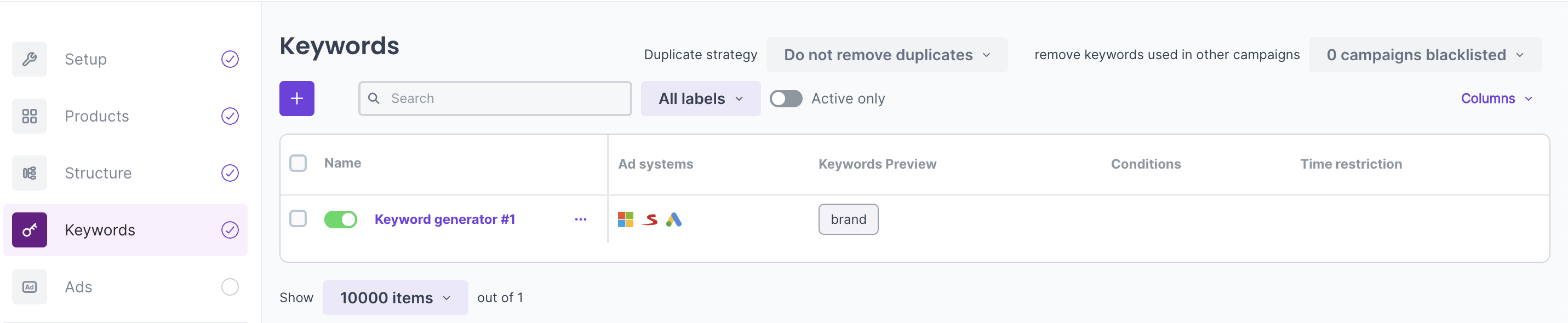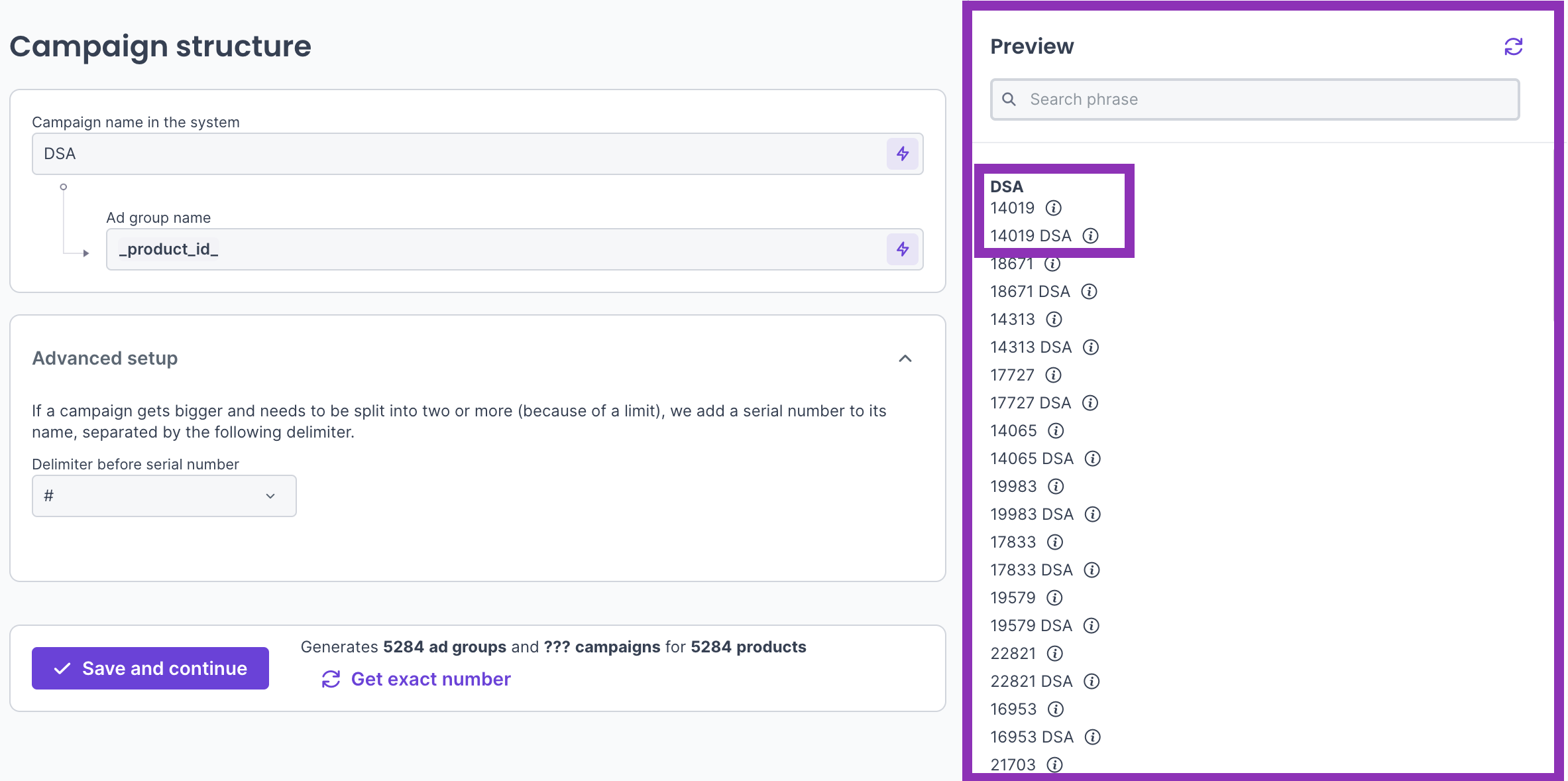 Once we've created the campaign and set up the structure, we can now see a preview of our products, where we can see both classic ad groups and DSA adgroups, so you can check everything clearly.