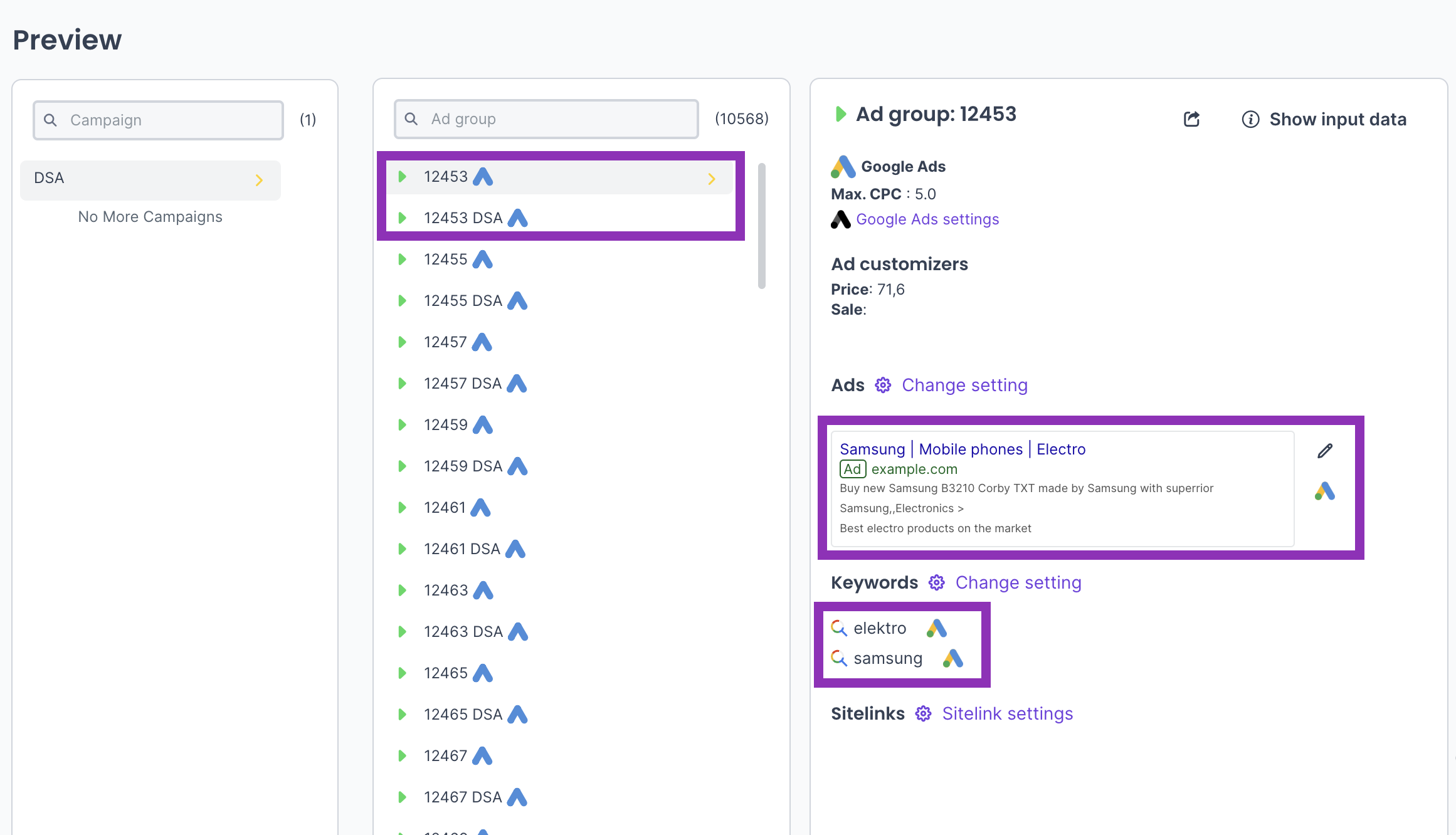 Save the campaign and a preview is waiting for you on the right, where you can check that our product contains classic ad text and keywords, as well as DSA ad group.