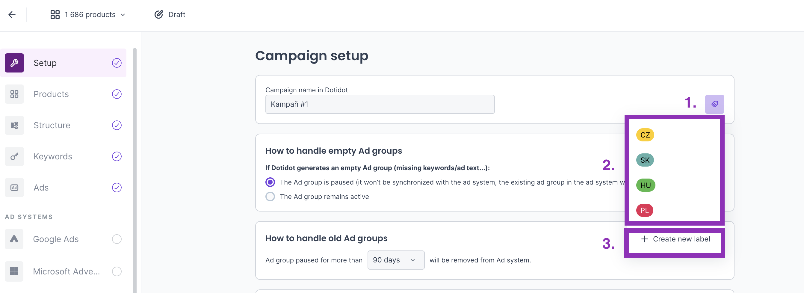 1. In the campaign settings, click on the label sign.